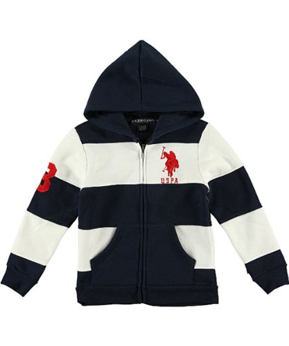 | Add comfort and style to his look with this bold hoodie from U.S. Polo Assn. Made of soft fleece, it features a full zip, ribbed trim, and a colorful embroidered logo on the chest. Stylish touches include a jersey hood lining and allover paneled striping. Check out our full line of U.S. Polo Assn. for some perfect matches! 65% Cotton, 35% Polyester Machine Wash Cold Made in China ...Read